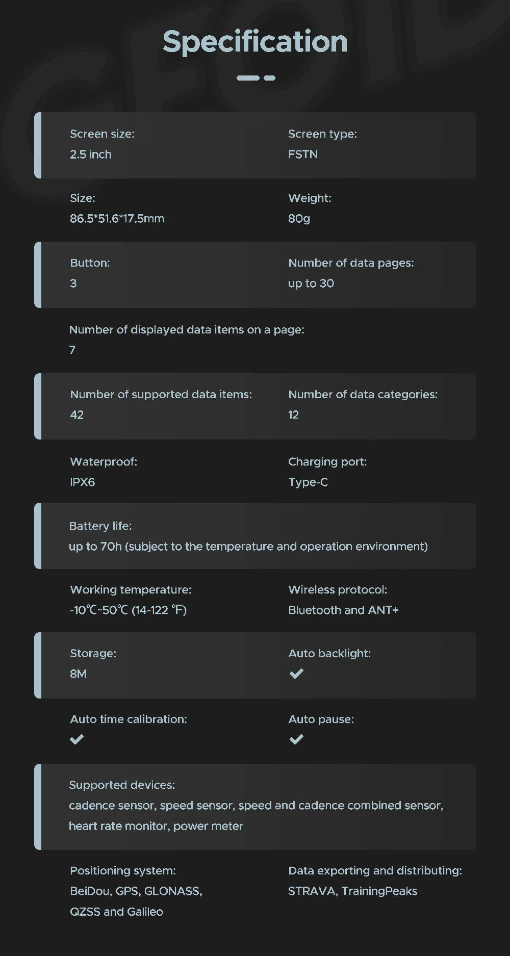 Dankzij de IPX6-waterdichte behuizing en automatische verlichting is je ritdata altijd goed zichtbaar, overdag én ’s nachts. USB-C opladen en een batterijduur van 70 uur zorgen voor probleemloze lange ritten.