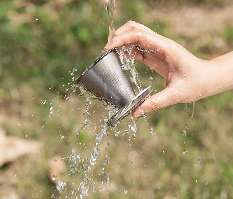 De pour-over kegelvormige dripper is uitgerust met een 0,1 mm micro-geperforeerd fijnmazig filter. Hierdoor zijn papieren filters overbodig en blijven de natuurlijke koffieoliën behouden voor een vollere, rijkere smaak. De filter is eenvoudig afneembaar, waardoor de set weinig ruimte inneemt in je rugzak of keukenkast.