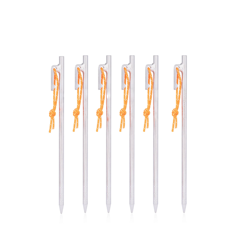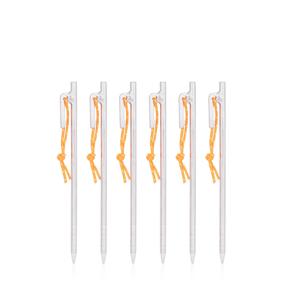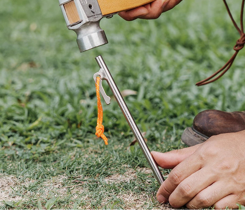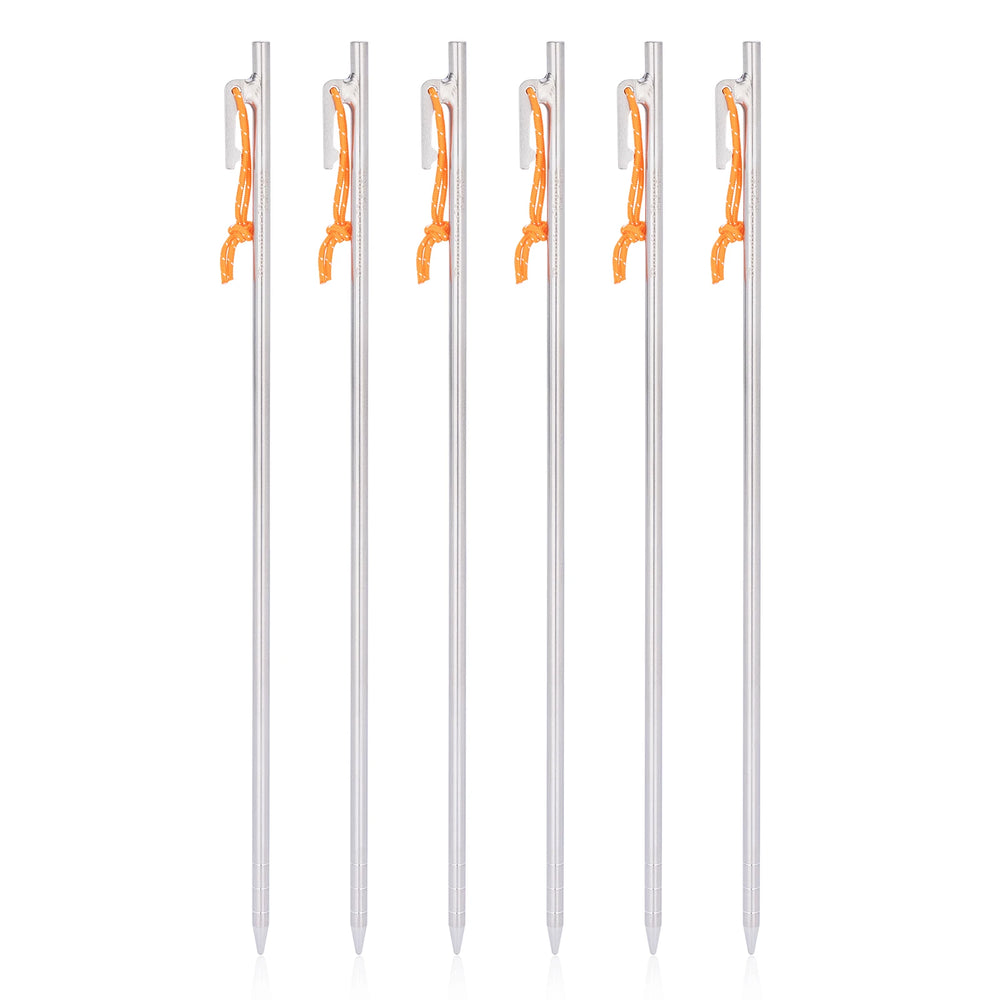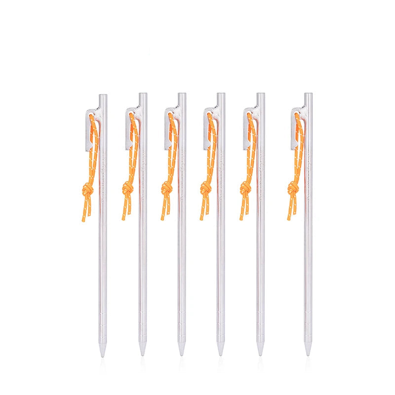 Gemaakt van titaniumlegering, zijn de haringen sterk, duurzaam en corrosiebestendig. Ze hebben twee keer de sterkte van aluminium of staal, waardoor ze uitstekend bestand zijn tegen ruwe omstandigheden zonder te buigen of te roesten.