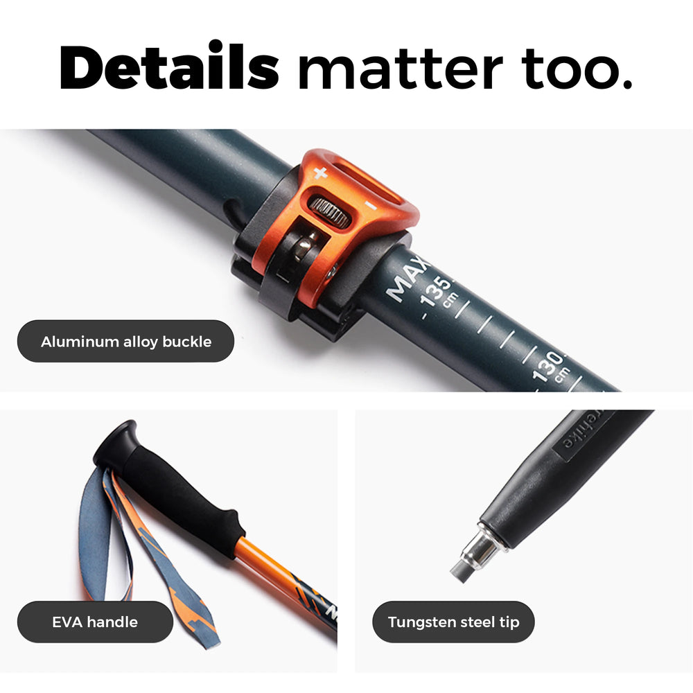 De wandelstok combineert een slank, lichtgewicht profiel met hoogwaardige materialen. De telescopische constructie maakt snelle en eenvoudige lengte-aanpassing mogelijk, ideaal voor lange beklimmingen en wandeltochten.
